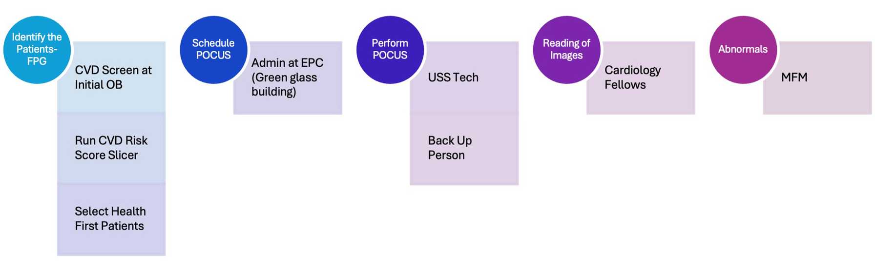 We are an active site for a National Heart, Lung and Blood Institute (NHLBI)–funded program, Heart Outcomes in Pregnancy Expectations (HOPE), which targets mothers who have known high-risk factors for severe CVD in pregnancy (e.g. obesity, advanced maternal age, family risk factors). Building on the success of these strategies that focus on screening for CVD, we have been developing a Program to offer universal CV screening using POCUS to all comers, focusing initially on Healthfirst patients.